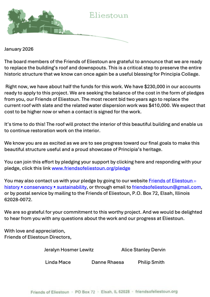 Third, please know that we will soon request letters of support to Principia in the 90 days after the final milestone is presented. We could use one from you! These will be “official” letters (not just casual emails), addressed to Douglas Gibbs, Principia College, Elsah, IL, but sent to friendsofeliestoun@gmail.com (or mailed to Friends of Eliestoun, PO Box 35, Elsah, IL 62028). If you choose to write, your letter should include your name and address and state why you believe the Friends of Eliestoun should be allowed to renew and revitalize the Eliestoun estate. Please be thinking of what you would like to say. We will contact everyone with another email when we are ready for the letters of support.